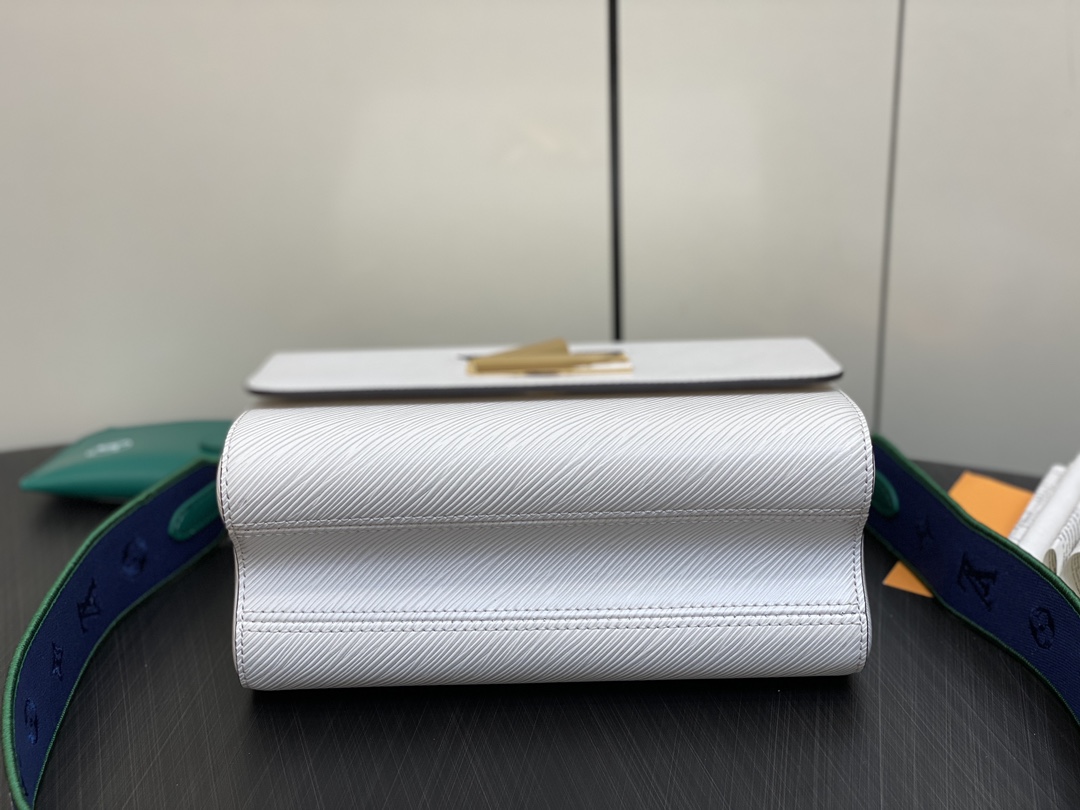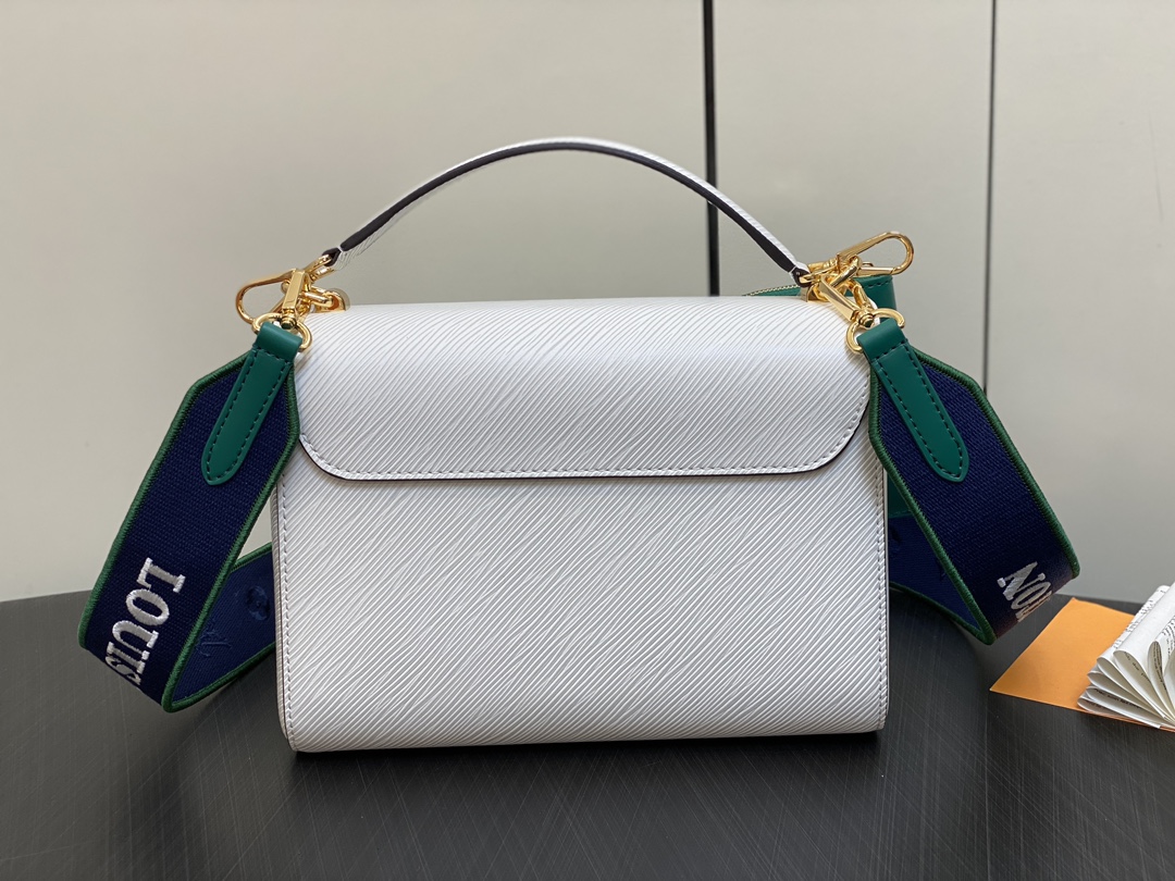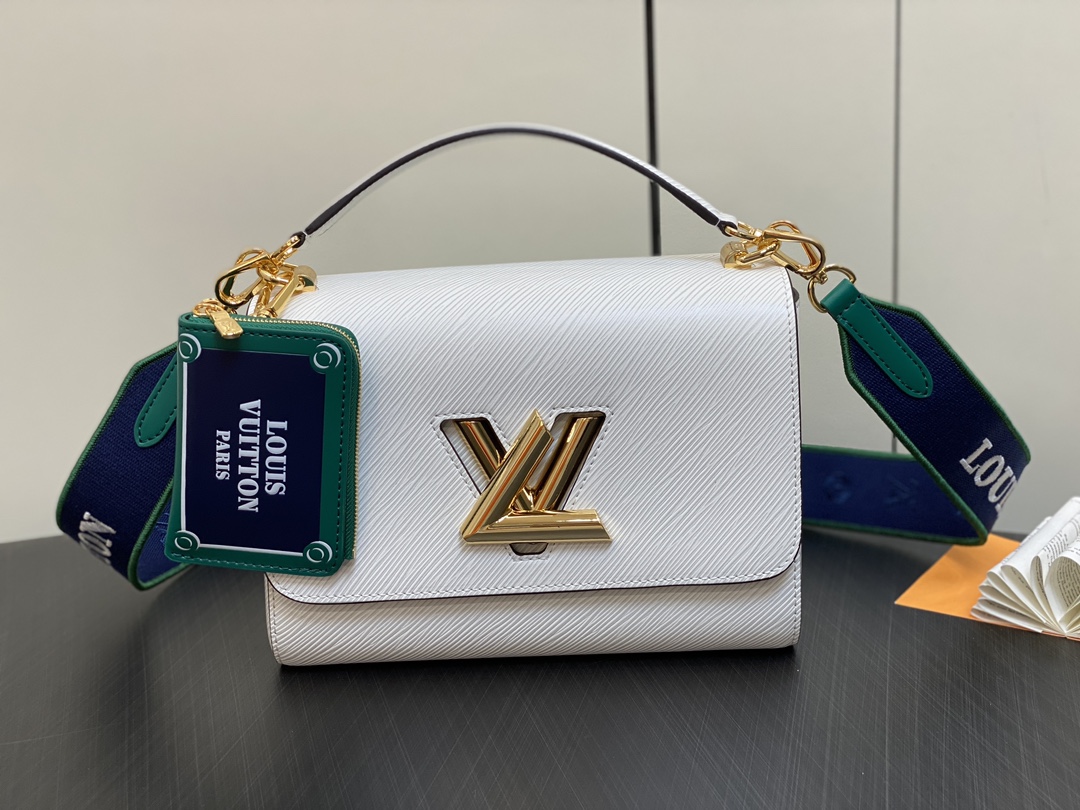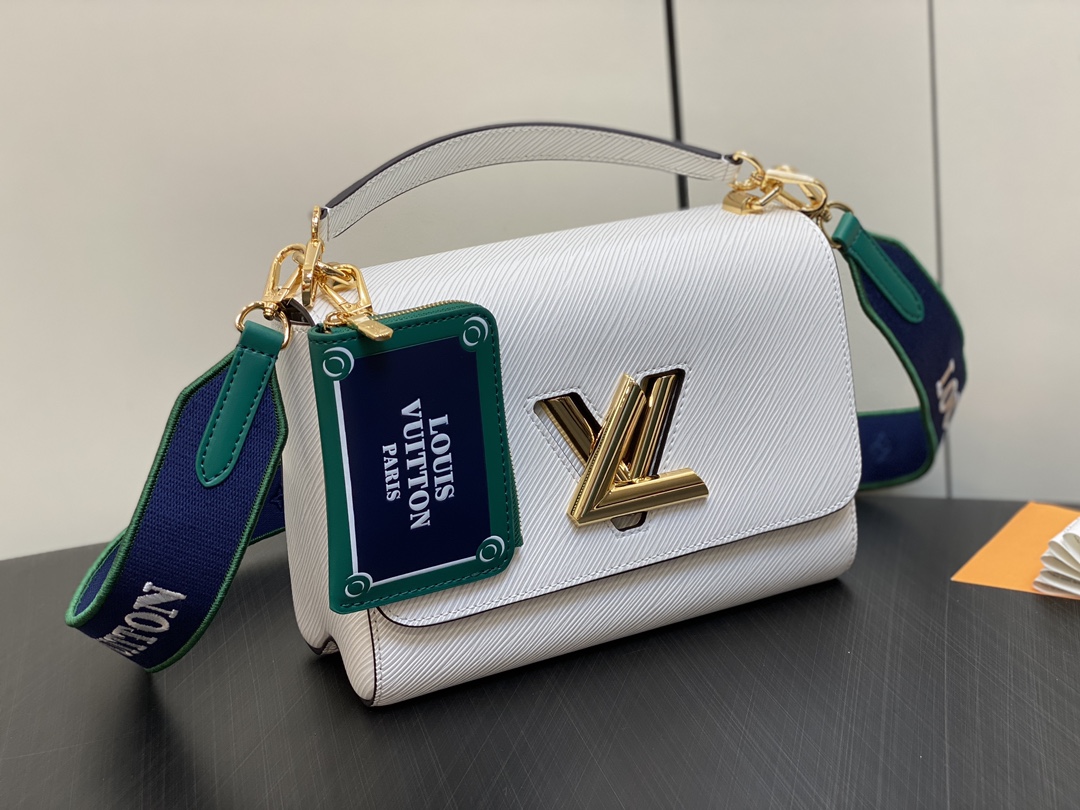 The Twist MM handbag looks stunning in white calfskin with a gold-color LV Twist lock and a leather charm inspired by the street signs of Paris. The detachable strap is in the same colorway as the charm and features “Louis Vuitton Paris” in white lettering. A removable leather top-handle gives another carry option.