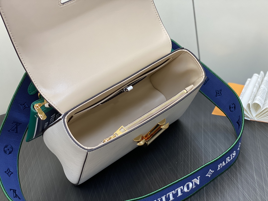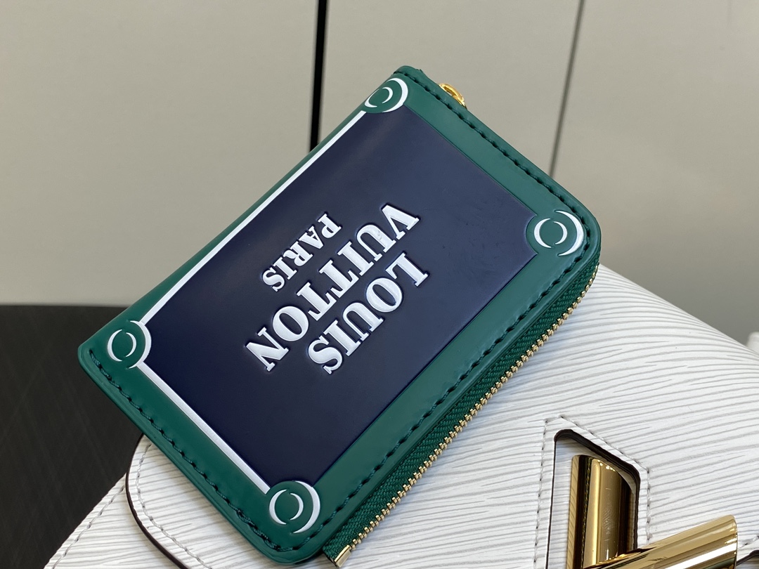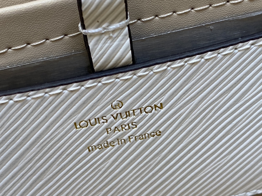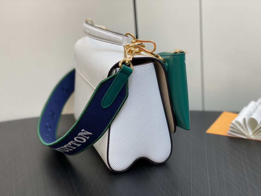 The Twist MM handbag looks stunning in white calfskin with a gold-color LV Twist lock and a leather charm inspired by the street signs of Paris. The detachable strap is in the same colorway as the charm and features “Louis Vuitton Paris” in white lettering. A removable leather top-handle gives another carry option.