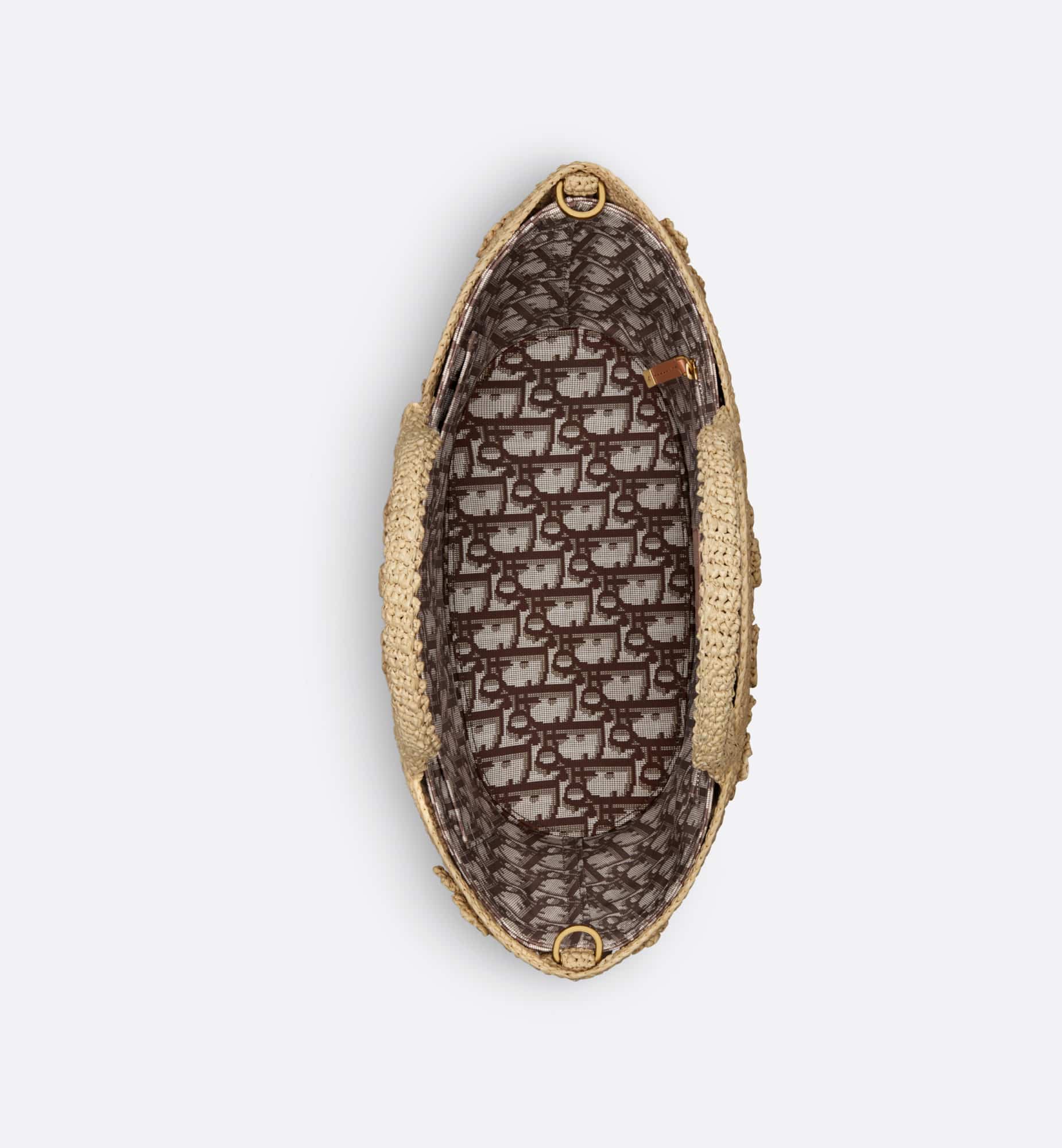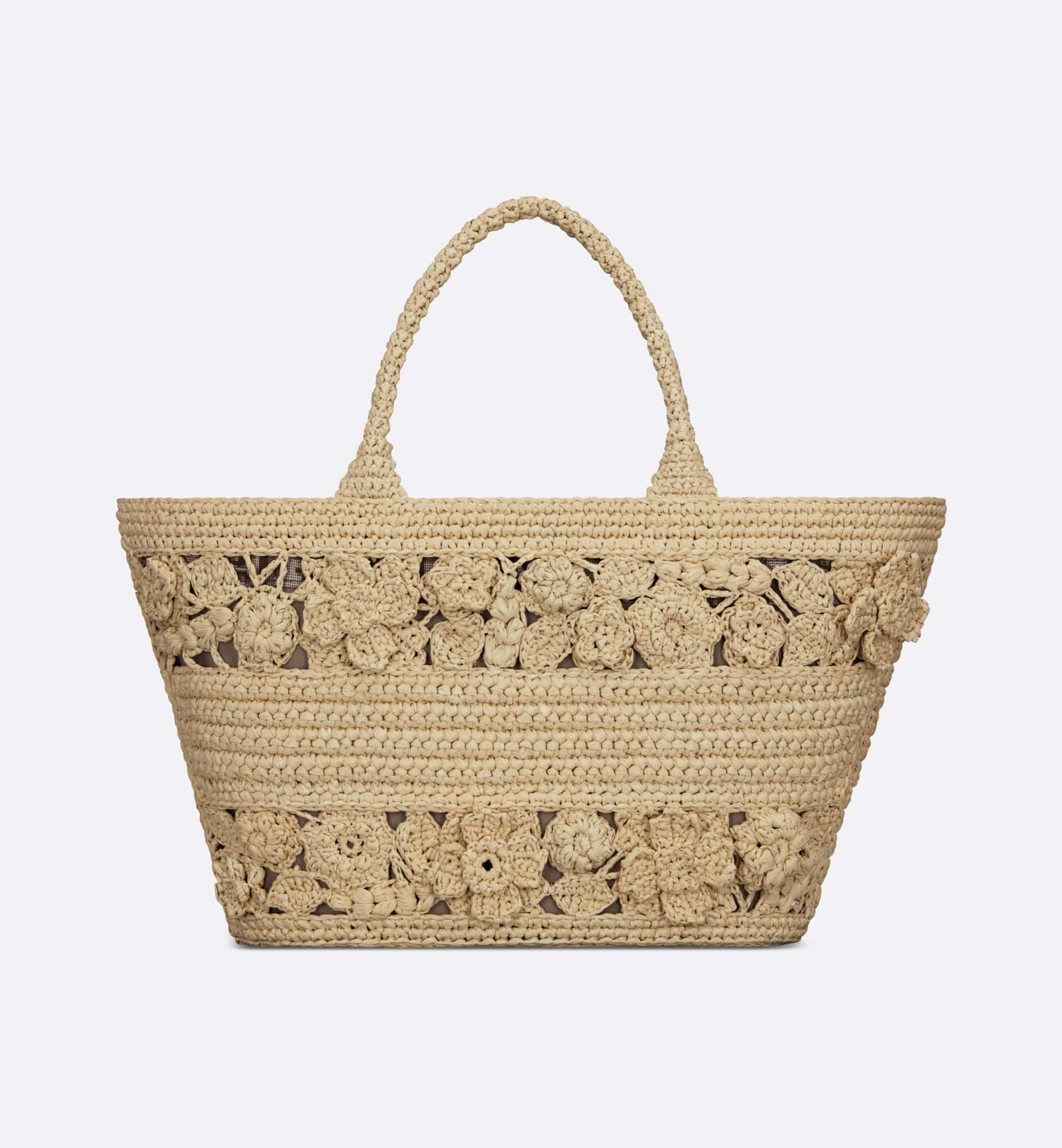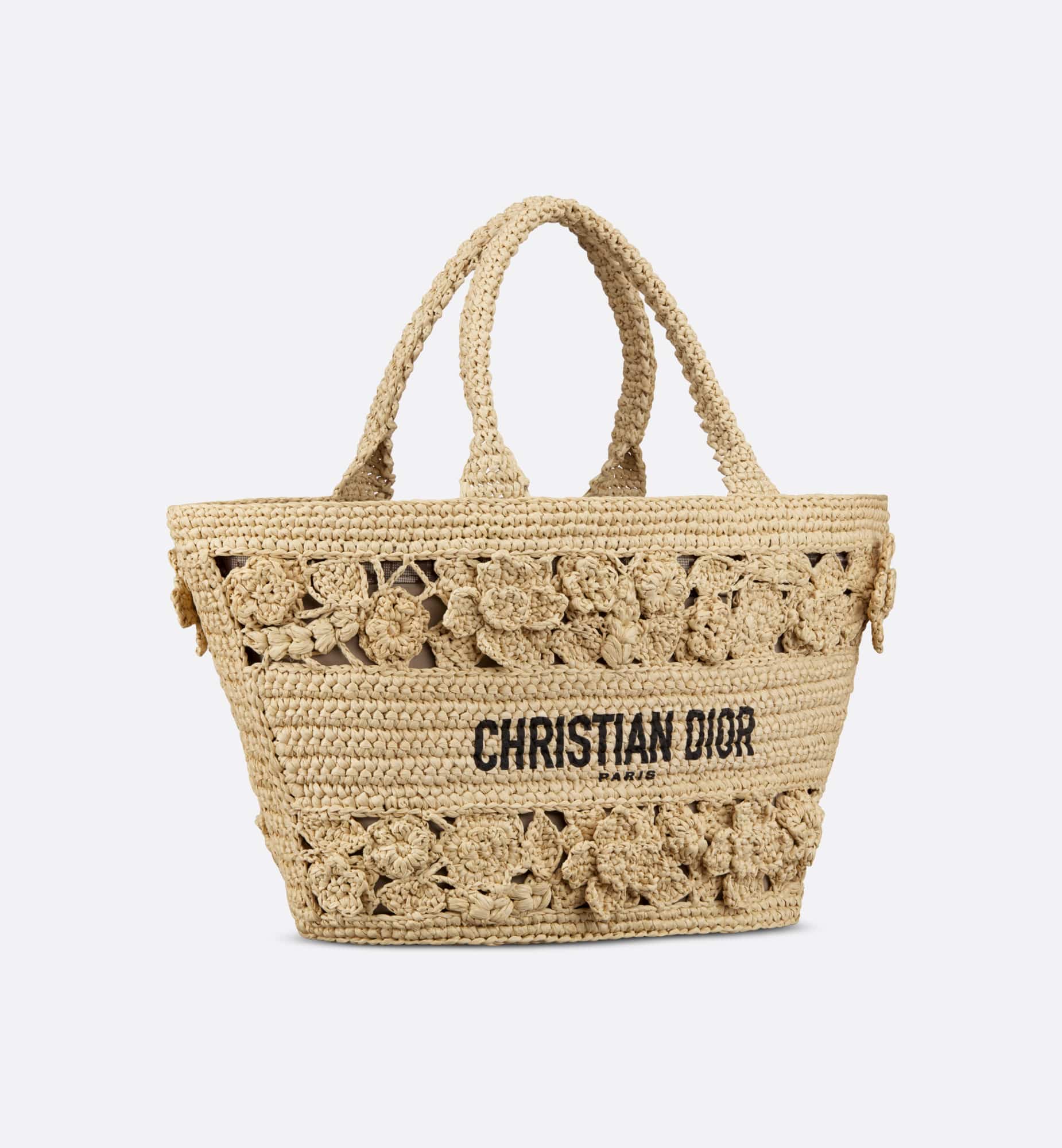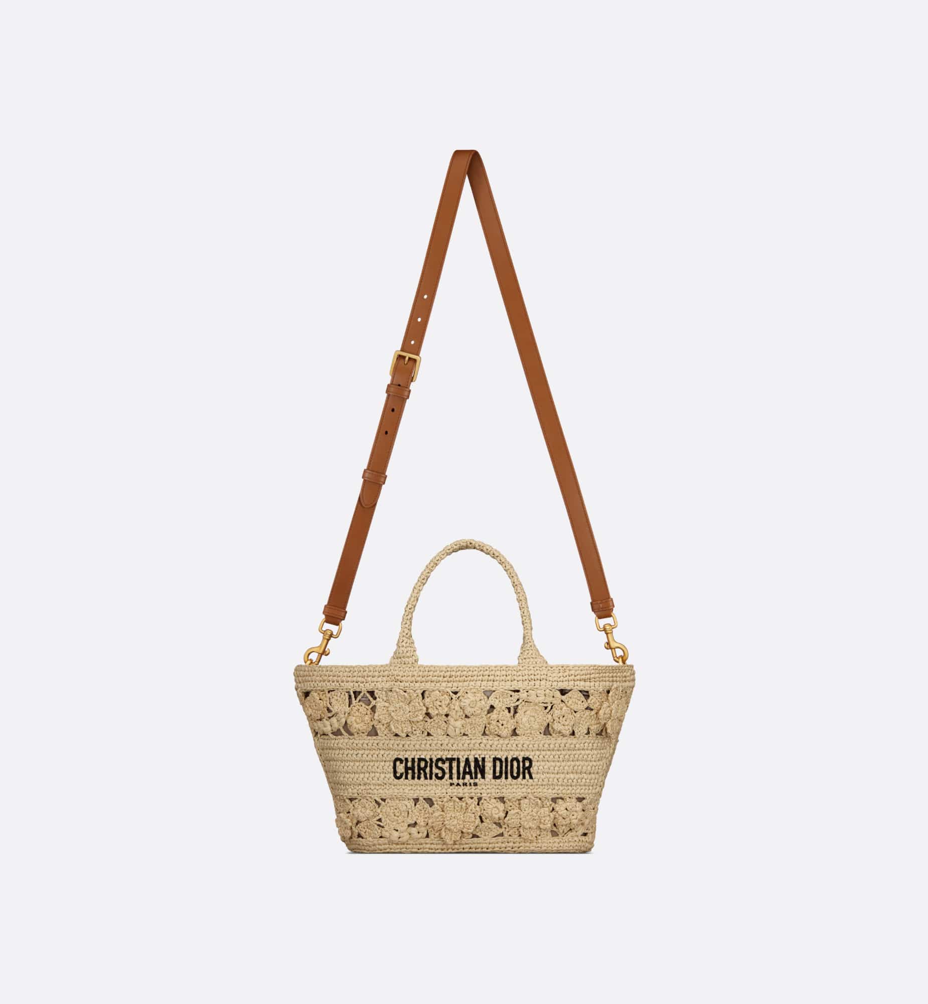 The hat basket bag stands out with its elegant silhouette combining functionality and refinement. Fully hand-embroidered in natural supple raffia and embellished with tonal flowers, the style is accented by the Christian Dior Paris signature on the front. Equipped with a tonal detachable zipped pouch, the spacious bag is completed by an adjustable and removable leather strap, allowing it to be carried by hand, worn over the shoulder or crossbody.