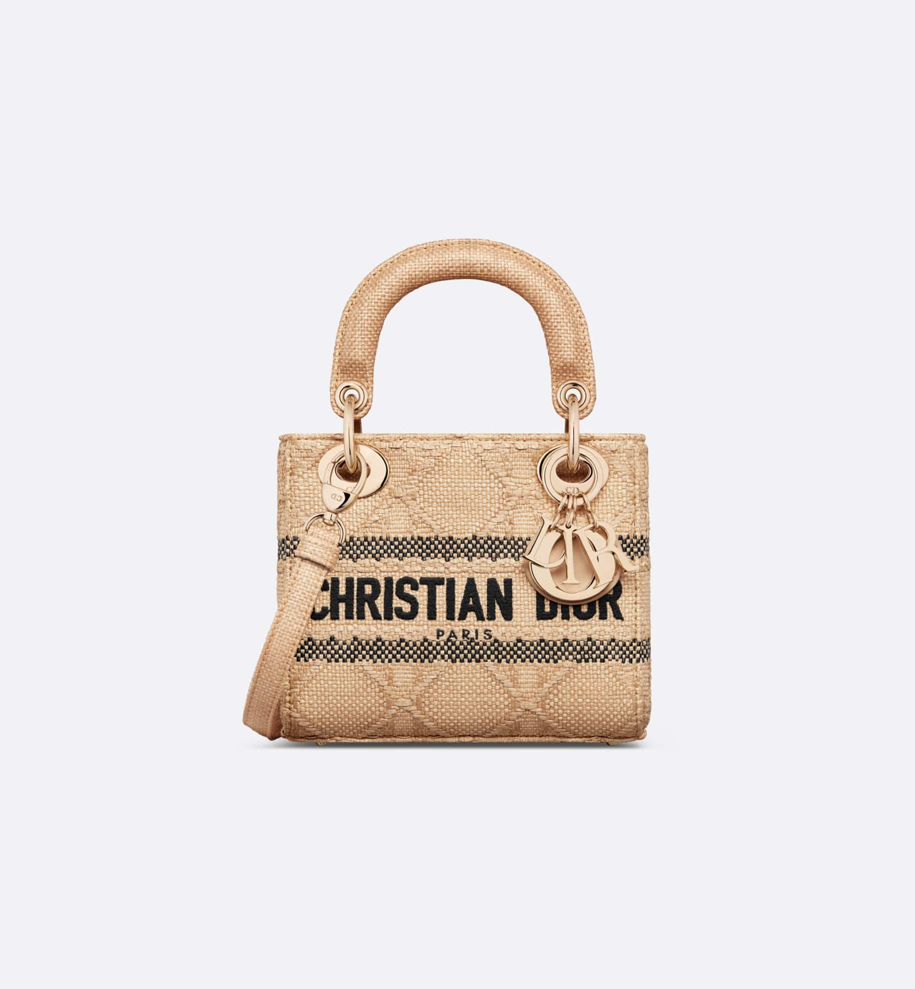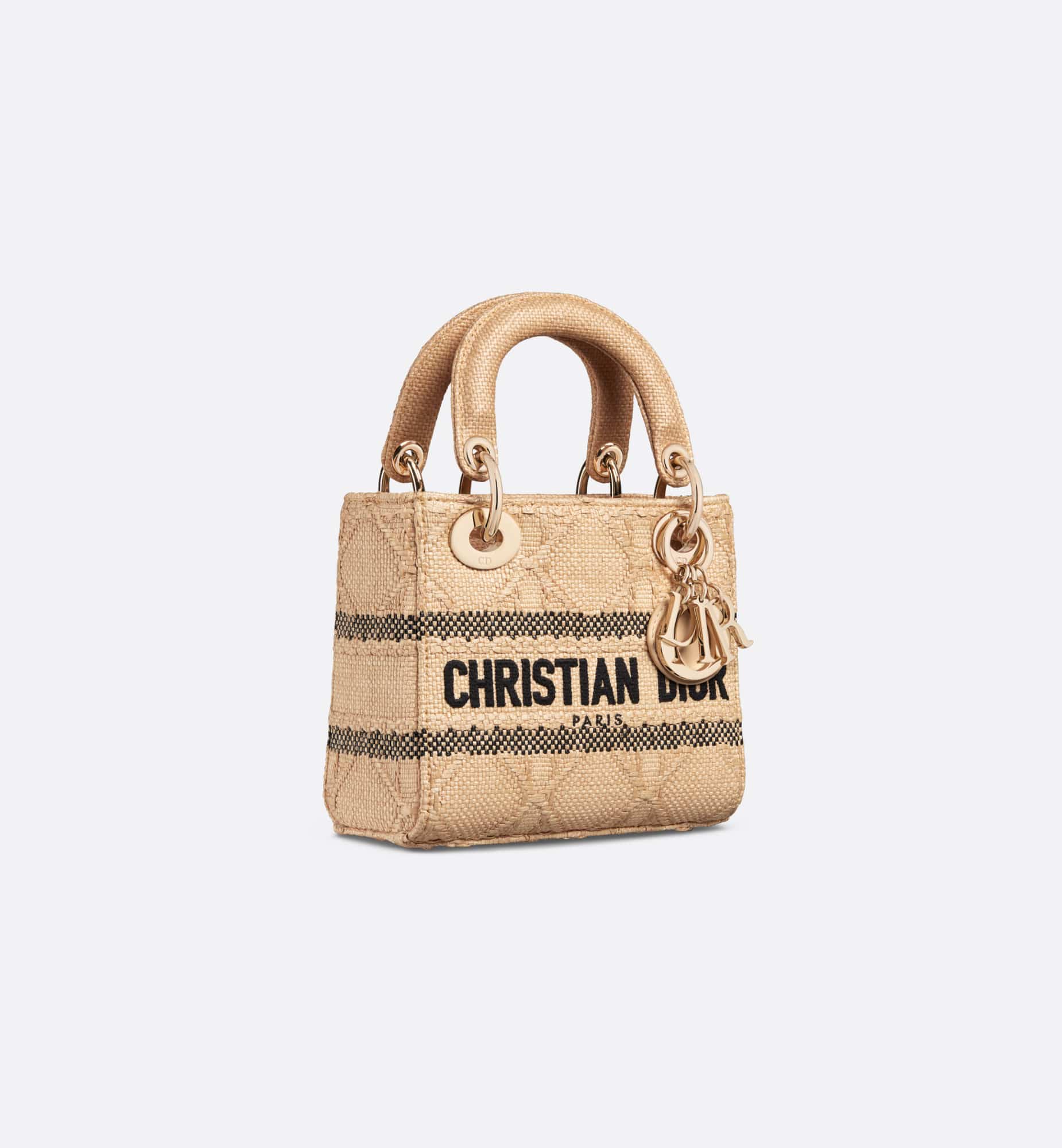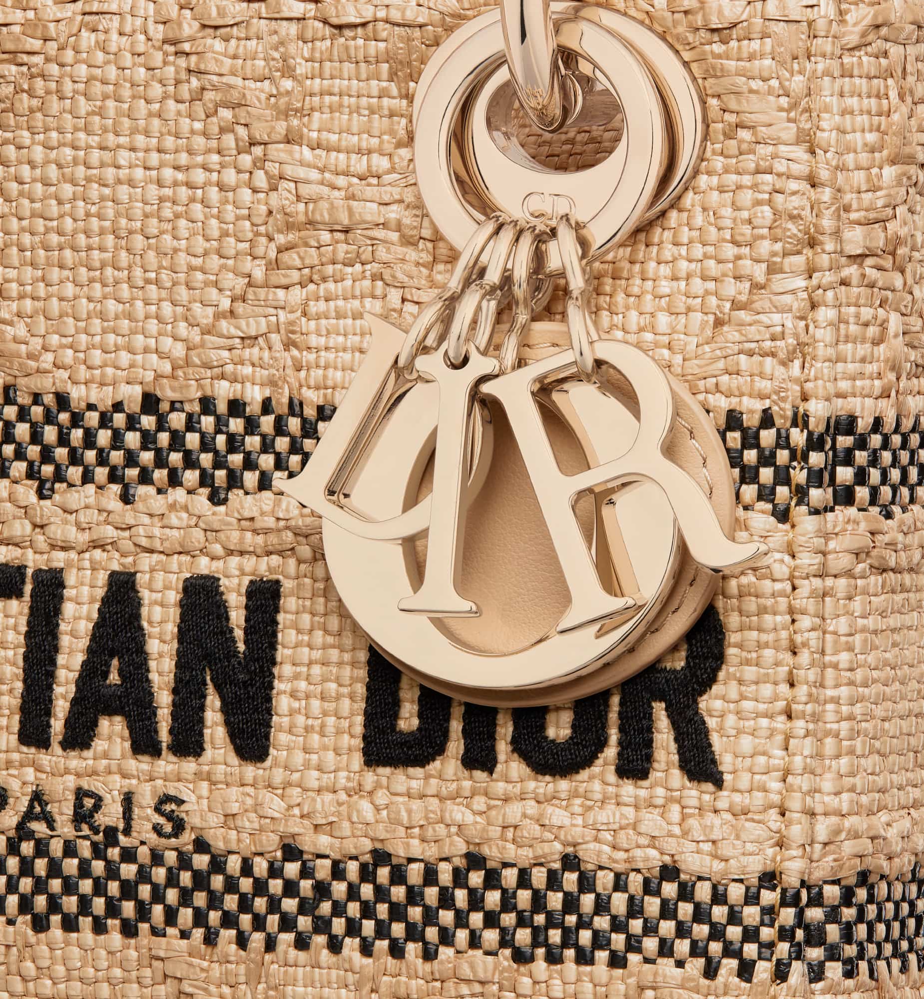 The Lady D-Lite bag combines classic elegance with House modernity. Crafted in natural raffia, it showcases hallmark Cannage stitching. A Christian Dior Paris signature adorns the front, while D.I.O.R. charms in pale gold-finish metal further enhance and highlight the silhouette. Featuring a thin, removable and reversible embroidered shoulder strap, the miniature Lady D-Lite bag can be carried by hand or worn crossbody.