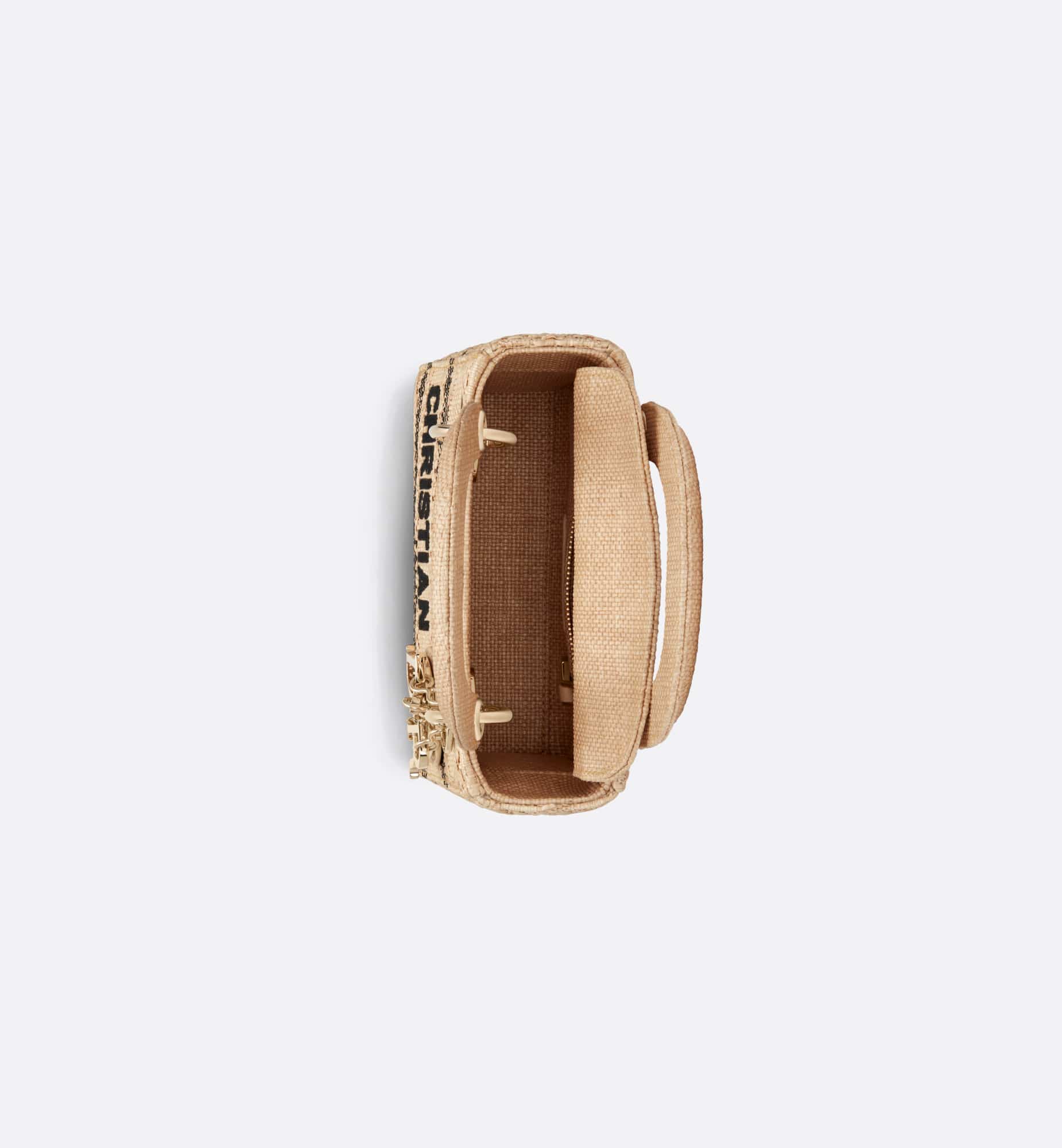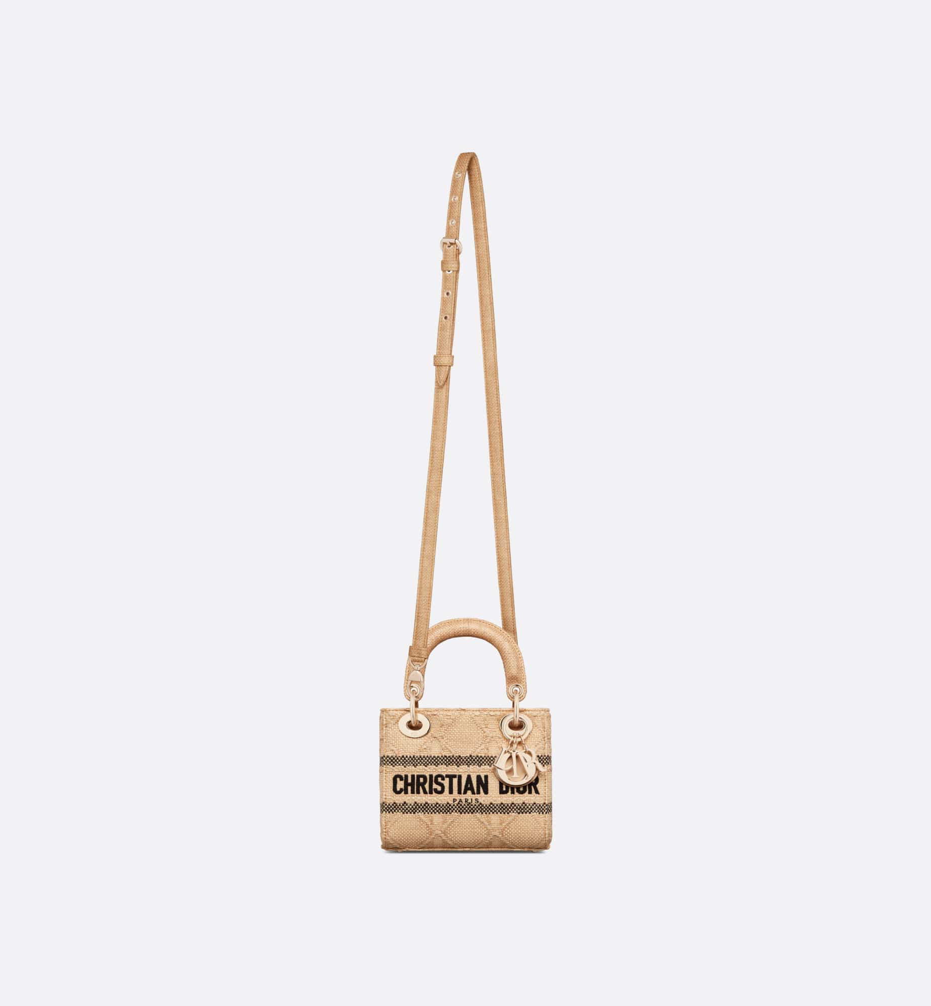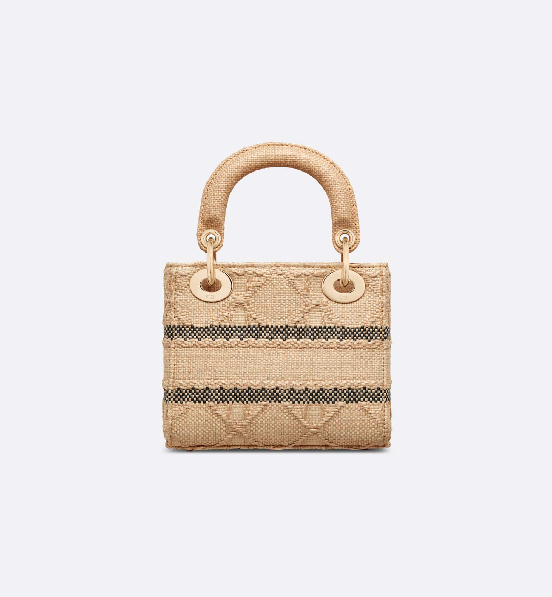 The Lady D-Lite bag combines classic elegance with House modernity. Crafted in natural raffia, it showcases hallmark Cannage stitching. A Christian Dior Paris signature adorns the front, while D.I.O.R. charms in pale gold-finish metal further enhance and highlight the silhouette. Featuring a thin, removable and reversible embroidered shoulder strap, the miniature Lady D-Lite bag can be carried by hand or worn crossbody.