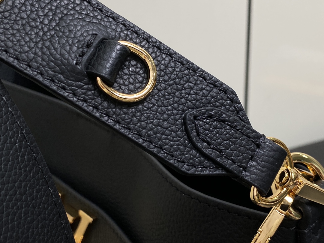 The Lock and Walk is a sleek bucket bag fashioned from grained calf leather. Lightweight and comfortable to carry, the bag combines casual ease with Parisian chic. A large front compartment secured with the LV turn lock provides convenient access to essential belongings. The detachable smart strap and golden chain handle provide for different carry styles.