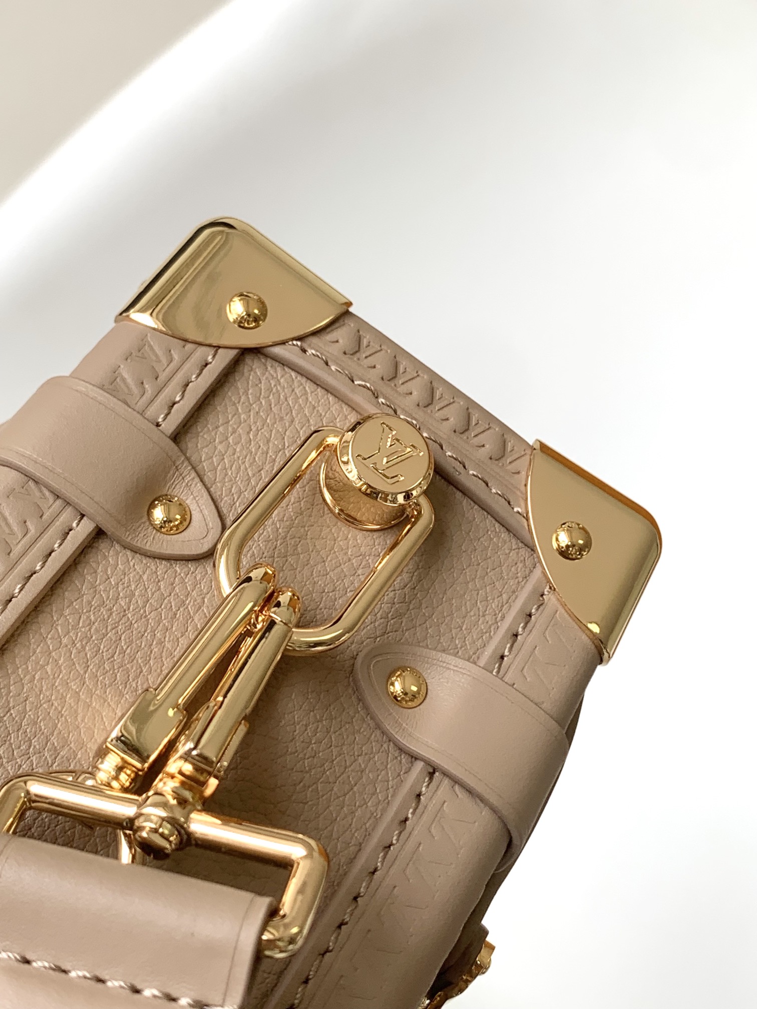The elegant Side Trunk MM handbag is Creative Director Nicolas Ghesquière’s ode to the House’s historic trunks. Made from grained calf leather with smooth cowhide-leather trim, it features an S-lock and reinforced metallic corners. The removable handle enables hand carry while the detachable and adjustable leather strap adjusts for shoulder and cross-body wear.