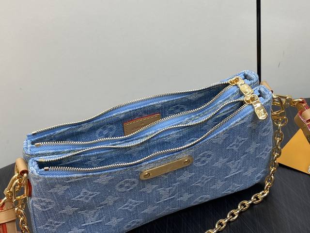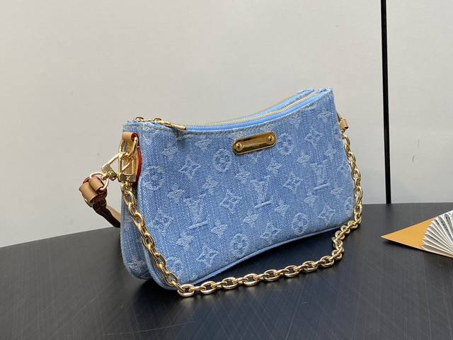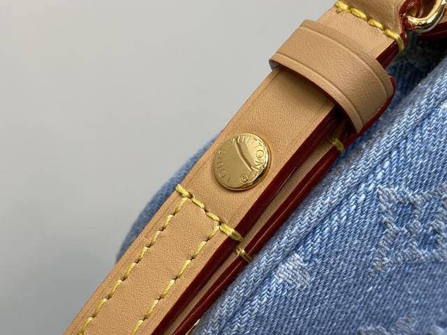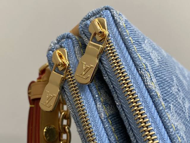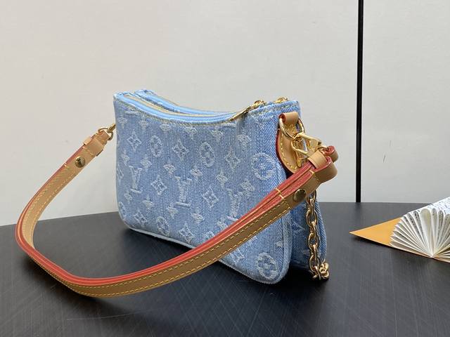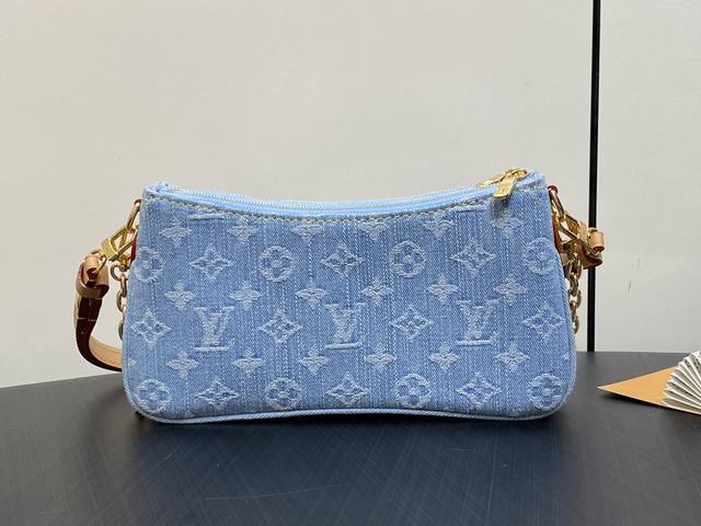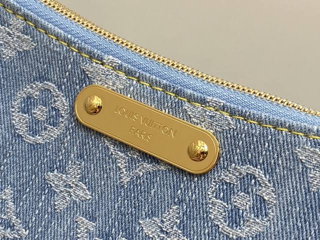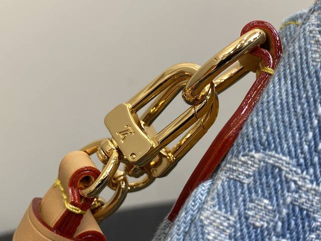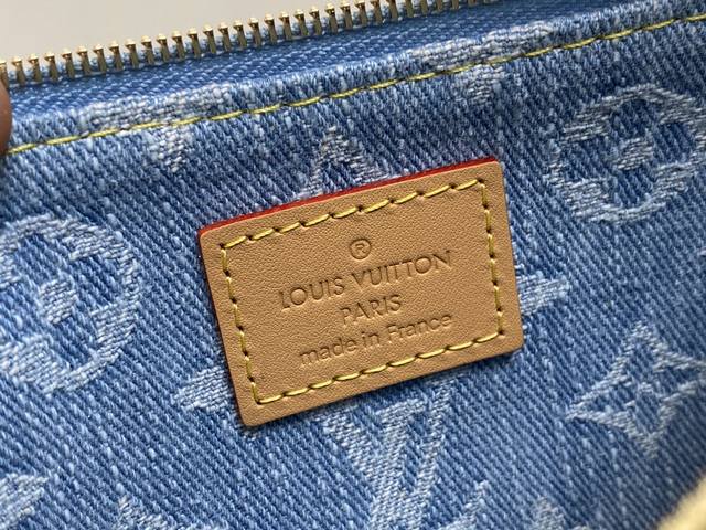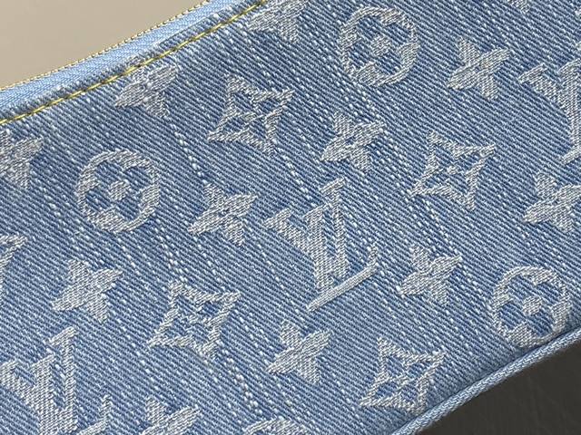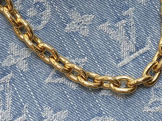 The Liv pochette is revisited in bleached and stonewashed Monogram denim for a vintage look and a summery feel. Designed to sit snugly under the arm, this small bag comes with a removable chain in gold-tone metal and a removable, adjustable strap in aged natural leather. It is signed with a Louis Vuitton-engraved plaque.
