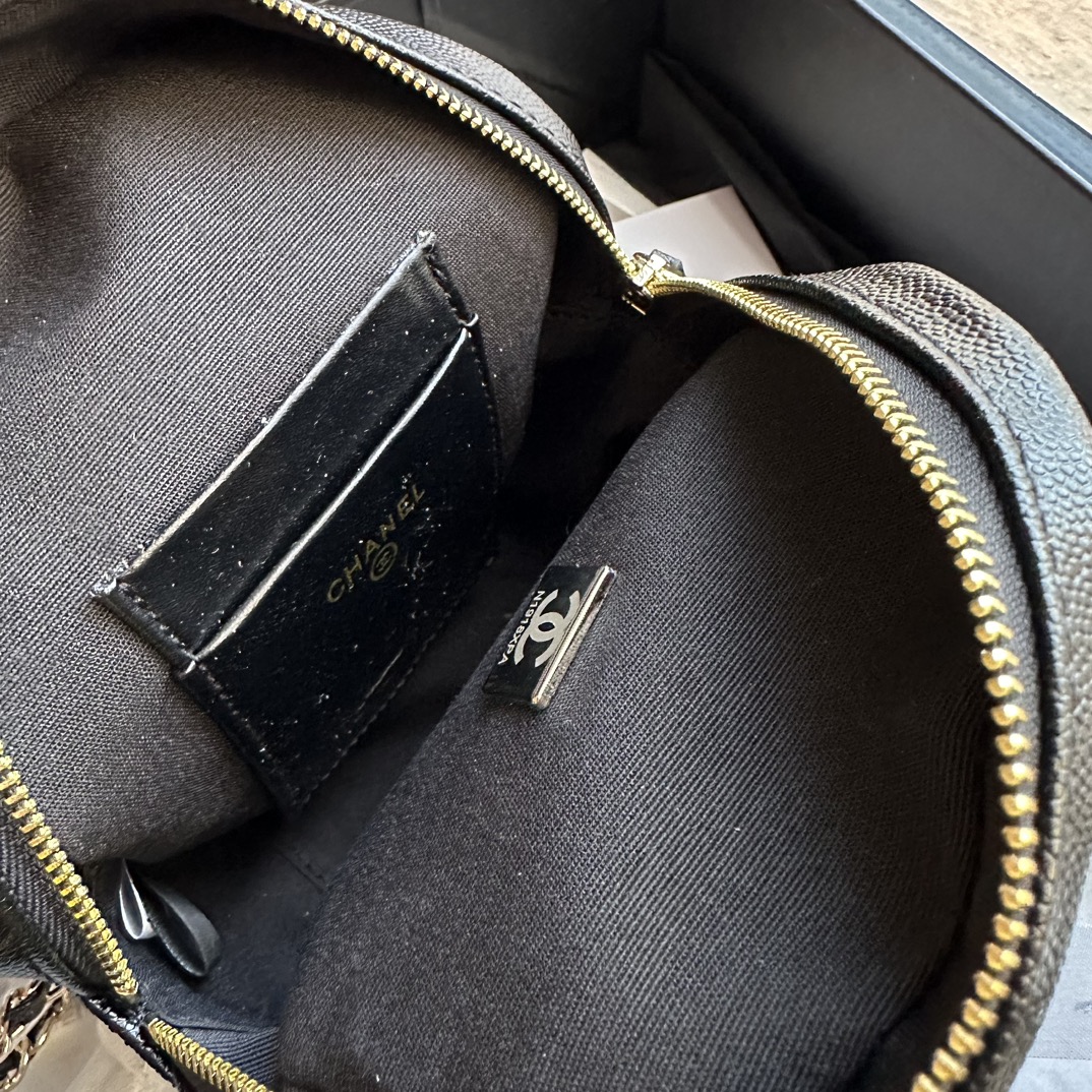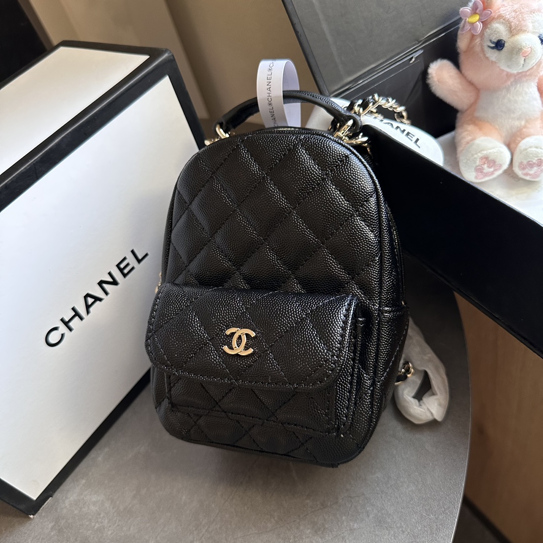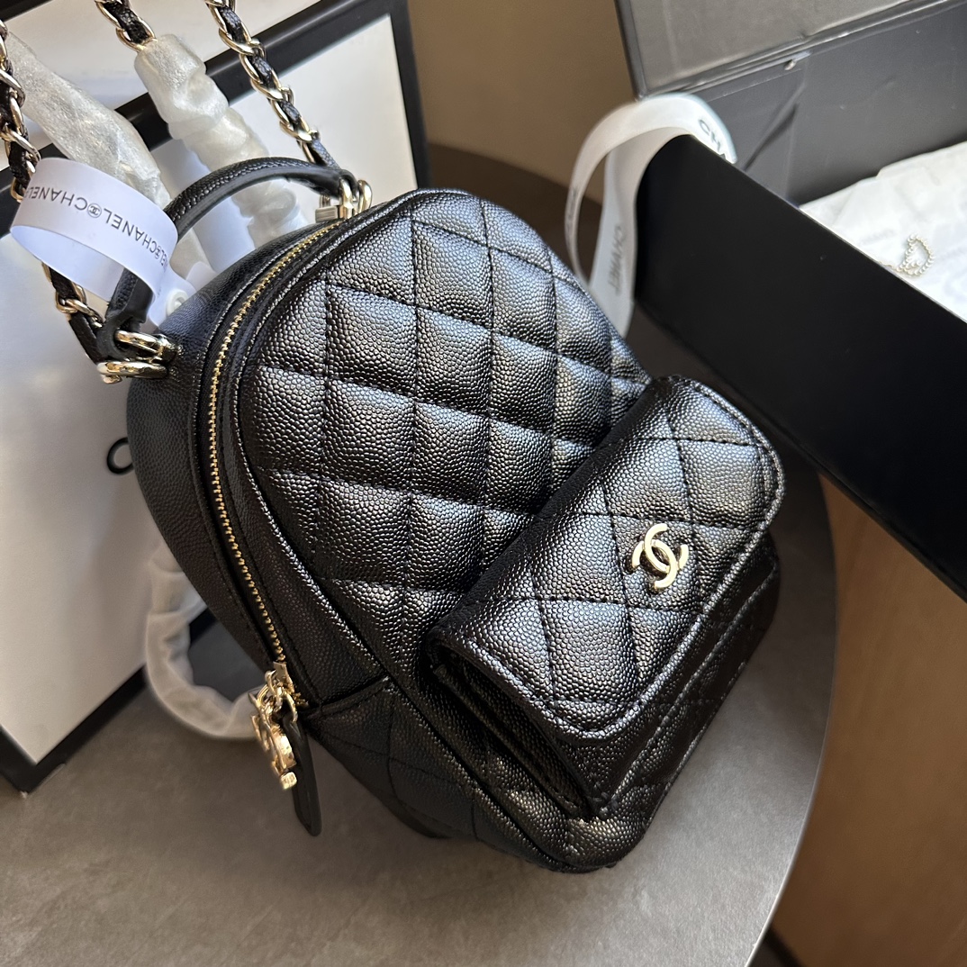 This Mini Phone Holder Backpack with Chain is in Black Caviar leather with Light Gold Hardware, features a backpack style bag, small front snap coin pocket with CC logo, leather top handle, zip around closure with leather pull and CC logo charm, convertible light gold tone chain interwoven with black leather crossbody/shoulder strap.